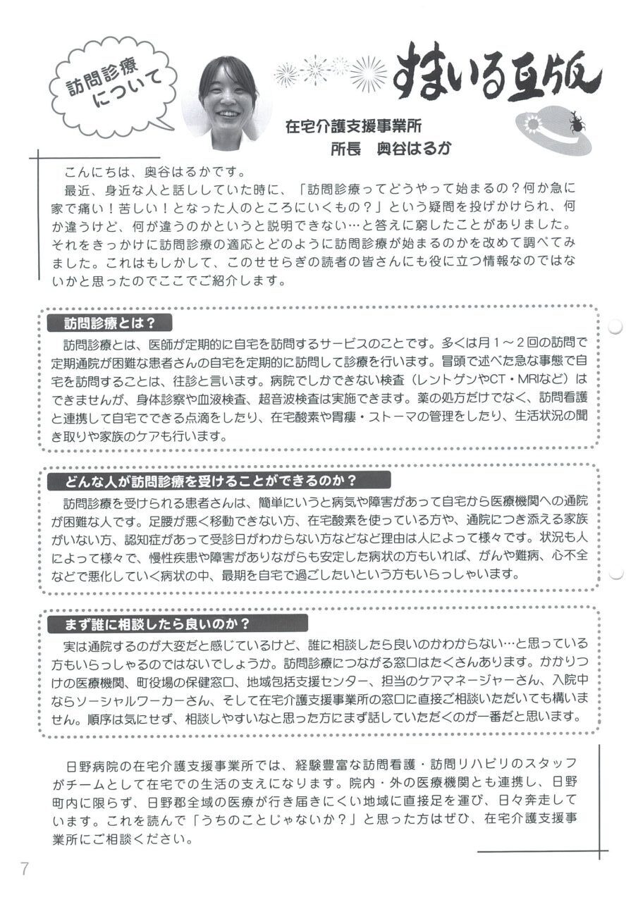 訪問診療をご希望の方は、外来看護師または地域連携推進室スタッフまでご相談ください。